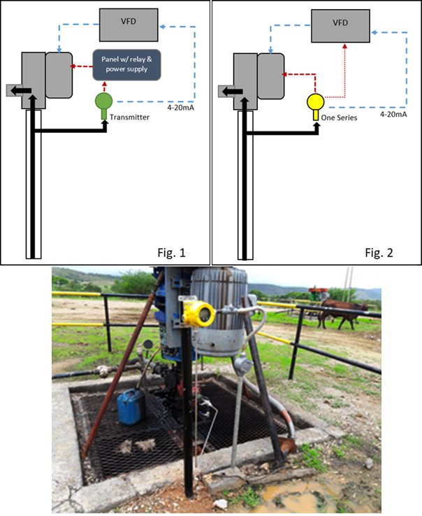 The NOC chose the ONE Series SIL 2 Safety Transmitter with Safety Relay Output (SRO) because it combined the 4-20 mA output that went to the VFD with an integral safety relay that could directly shut down the PC pump (see picture). With the analog signal connected to the VFD and the embedded logic solver and relay providing redundant safety shutdown of the PC pump, the external power supply, relay and added enclosure were eliminated. An additional digital signal could be inputted to the VFD to alert it in the event the pump was shut down (see Fig. 2).