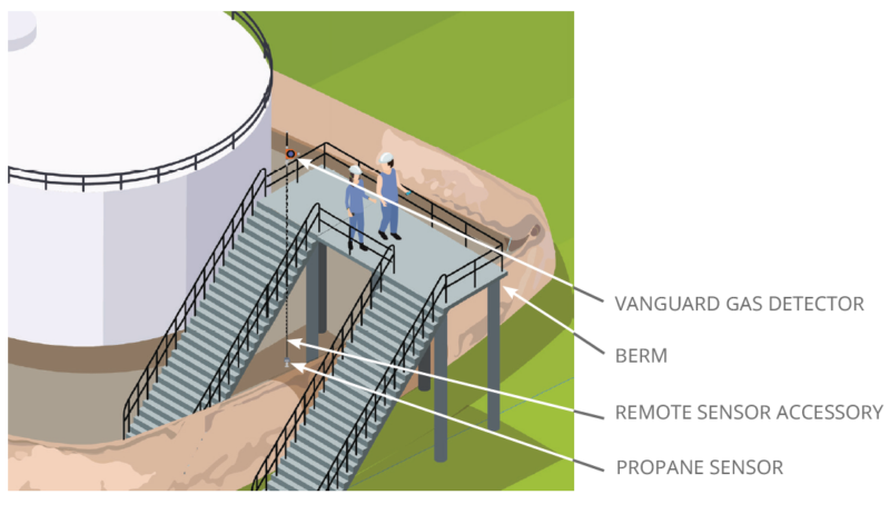 An end user wants to use the Vanguard gas detector to monitor for propane leaks within their tank farms. Since propane gas is heavier than air, their propane sensors must be placed at the bottom of the berms surrounding their tanks. Once a month, due to the user’s plant requirements, maintenance checks must be performed on the Vanguard gas detectors. They must send a worker down into each berm to check each unit. With approximately 50 tanks on-site and multiple gas detectors per tank, the end-user would have to climb down into each berm to check operation. Some berms are split into multiple sections and would require climbing in and out several times to check each Vanguard.