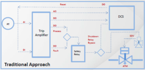 These SIS systems can be complex, including multiple components such as a pressure or temperature transmitter, safety relay, programmable logic controller (PLC). Also, it can include a trip amplifier; and requires intensive wiring and programming. See figure 1.